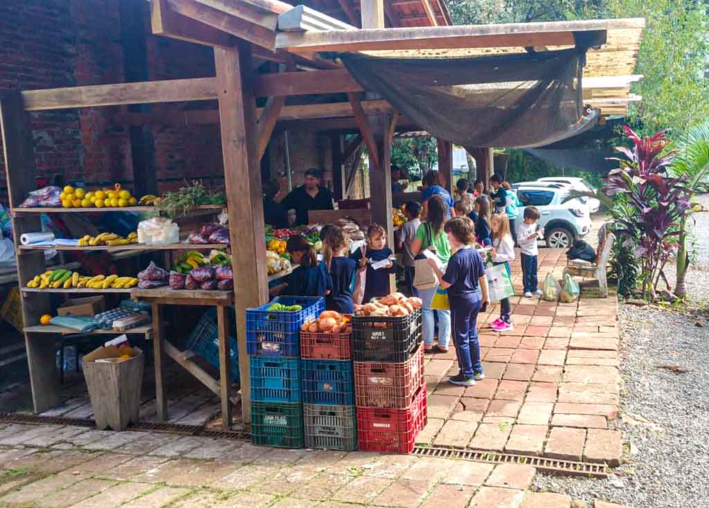 Antes da visita, em sala de aula, as crianças conheceram a obra “A Feira”, da pintora Tarsila do Amaral. Já na visita, elas tiveram a oportunidade de compreender melhor o conceito e o funcionamento de uma feira. Conversaram com as agricultoras e agricultores locais, aprenderam sobre produtos orgânicos e realizaram suas próprias compras, vivenciando uma experiência real de participação na escolha dos alimentos.